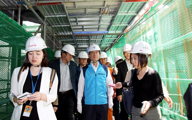 박원순 서울시장이 13일 서울 송파구 신천동 제2롯데월드 신축공사 현장을 방문해 안전점검을 하고 있다.