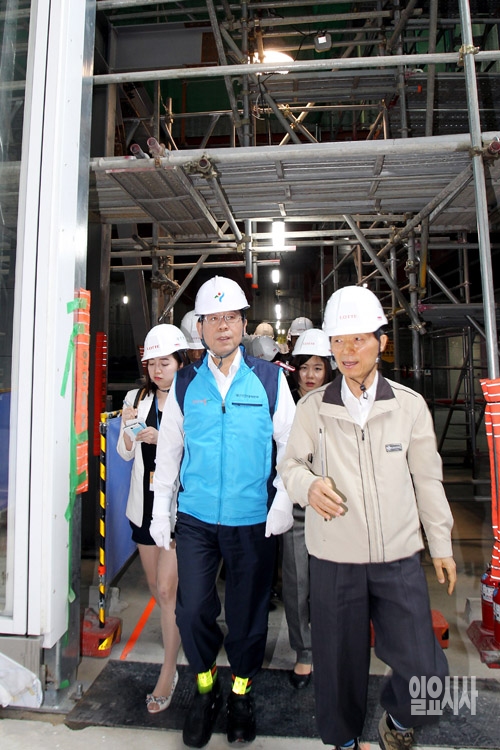 박원순 서울시장이 13일 서울 송파구 신천동 제2롯데월드 신축공사 현장을 방문해 안전점검을 하고 있다.