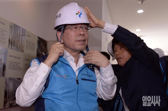박원순 서울시장이 13일 서울 송파구 신천동 제2롯데월드 신축공사 현장을 방문해 안전모를 착용하고 있다.