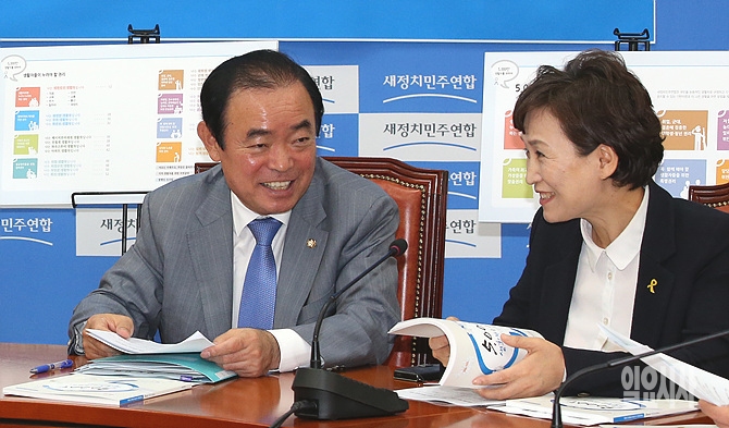 12일, 새정치민주연합 장병완 정책위의장이 서울 여의도 국회에서 열린 6·4지방선거 정책공약집 기자간담회 도중 김현미 원내정책수석부대표와 이야기를 나누며 웃고 있다.
