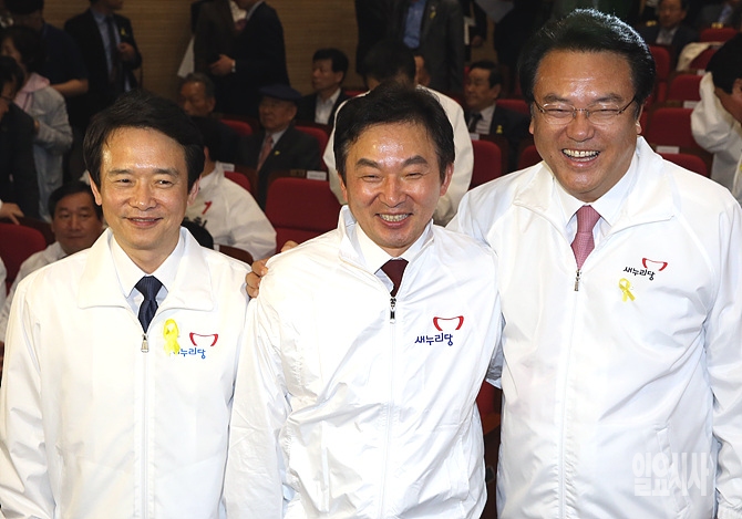 13일 오후, 서울 여의도 국회 의원회관에서 열린 6·4지방선거 중앙선거대책위원회 발대식에 남경필 경기도지사 후보, 원희룡 제주시장 후보, 정진석 충남도지사 후보가 참석해 활짝 웃고 있다.