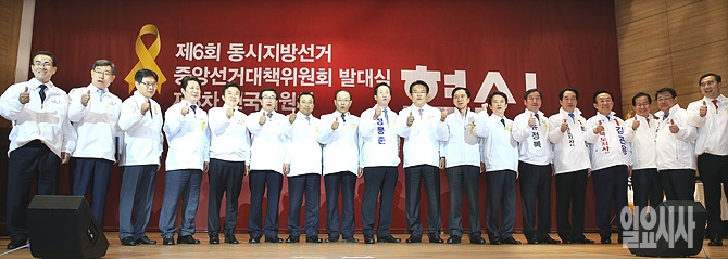 13일 오후, 서울 여의도 국회 의원회관에서 열린 6·4지방선거 중앙선거대책위원회 발대식에 유정복 인천시장 후보, 남경필 경기도지사 후보, 정몽준 서울시장 후보, 정진석 충남도지사 후보 등 선거 출마자 전원이 참석해 파이팅을 외치고 있다.