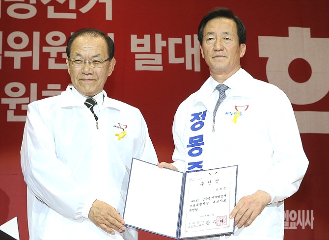 13일 오후, 서울 여의도 국회 의원회관에서 열린 6·4지방선거 중앙선거대책위원회 발대식에 정몽준 서울시장 후보가 같은 당 황우여 대표에게 추천장을 건네 받고 있다.