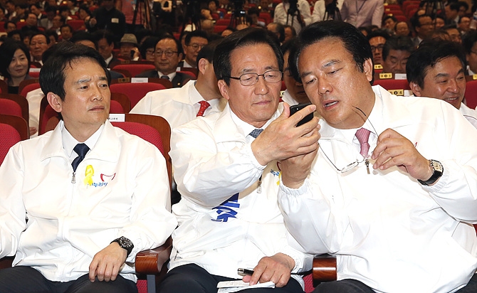 13일 오후, 서울 여의도 국회 의원회관에서 열린 6·4지방선거 중앙선거대책위원회 발대식에 남경필 경기도지사 후보와 정진석 충남도지사 후보가 정몽준 서울시장 후보의 스마트폰을 보고 있다.