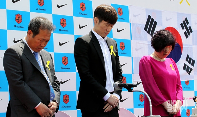 '영원한 캡틴' 박지성(가운데)과 부모님이 14일 경기도 수원 박지성축구센터에서 공식 은퇴 선언 및 김민지 아나운서와의 결혼계획 기자회견을 갖기에 앞서 세월호 희생자에 대한 묵념을 하고 있다.