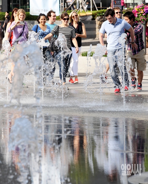 14일 연일 계속되는 무더운 날씨가 이어지는 가운데 서울 광화문광장 분수를 찾은 외국인들이 더위를 식히고 있다.