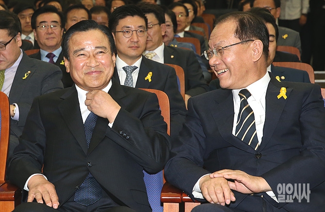 14일 오후, 서울 여의도 국회에서 열린 새누리당 의원총회에서 황우여 대표(사진 오른쪽)와 이완구 원내대표가 활짝 웃고 있다.