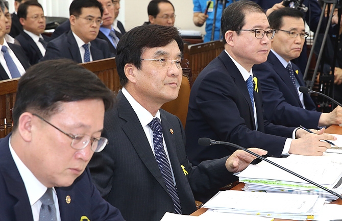 14일 오후, 서울 여의도 국회에서 열린 세월호 대책 관련 안행부 전체회의에서 강병규 안행부 장관이 의원들의 질문을 경청하고 있다.