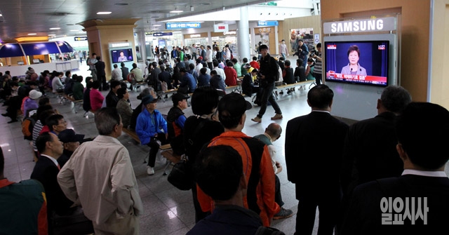 박근혜 대통령이 19일 청와대 춘추관에서 '세월호 참사'에 대한 대국민 담화를 발표하는 가운데 이날 시민들이 서울역 대합실에서 생중계를 지켜보고 있다.