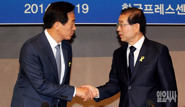 19일 서울 중구 프레스센터에서 열린 서울시장 여·야 후보 관훈토론회에서 정몽준 새누리당 서울시장 후보(왼쪽)와 박원순 새정치민주연합 서울시장 후보가 인사를 나누고 있다.