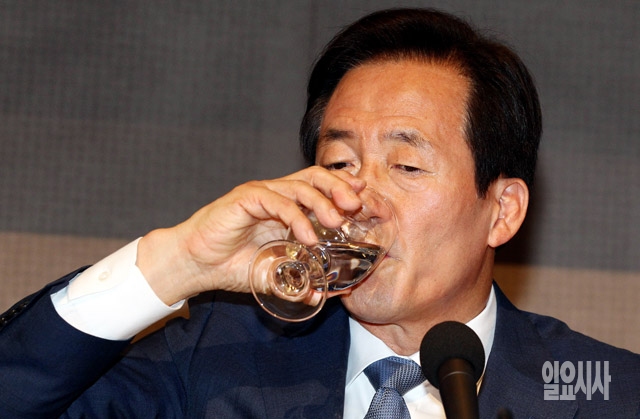 정몽준 새누리당 서울시장 후보가 19일 서울 중구 프레스센터에서 열린 서울시장 여·야 후보 관훈토론회에서 물을 마시고 있다.
