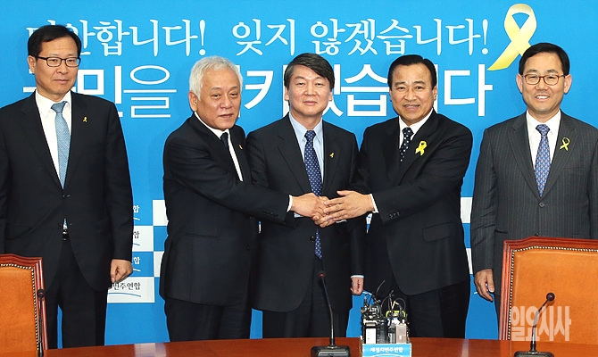 19일 오전, 서울 여의도 국회에서 김한길-안철수 새정치민주연합 공동대표와 새누리당 이완구 원내대표가 악수를 나누고 있다.
