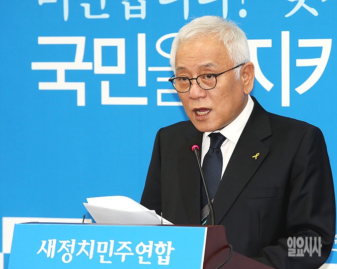 19일, 김한길 새정치민주연합 공동대표가 국회에서 이날 오전에 있었던 박근혜 대통령의 세월호 대국민 담화와 관련해 기자회견을 하고 있다.