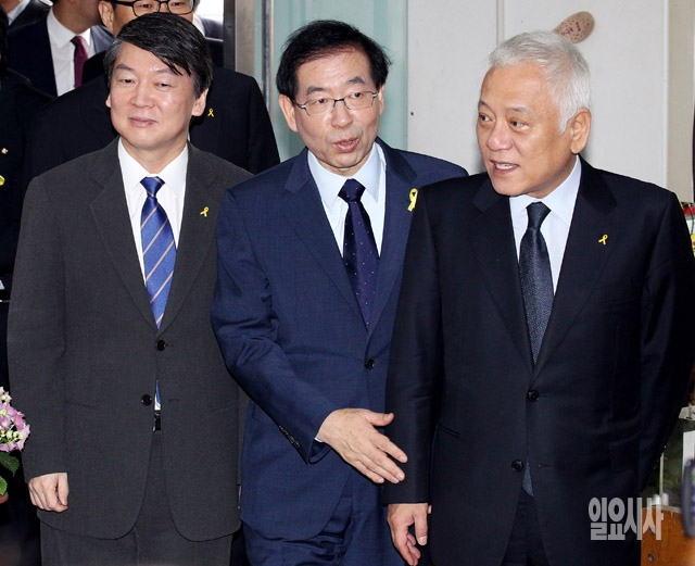 박원순 새정치민주연합 서울시장 후보(가운데)가 20일 서울 종로구 원순씨 캠프희망에서 열린 오픈하우스 캠프 출범식에 김한길(오른쪽), 안철수 공동대표와 들어서고 있다.