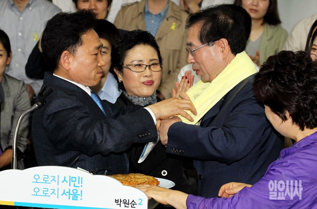 박원순 새정치민주연합 서울시장 후보가 20일 서울 종로구 원순씨 캠프희망에서 열린 오픈하우스 캠프 출범식에서 광장시장 상인들로부터 수건을 받고 있다.
