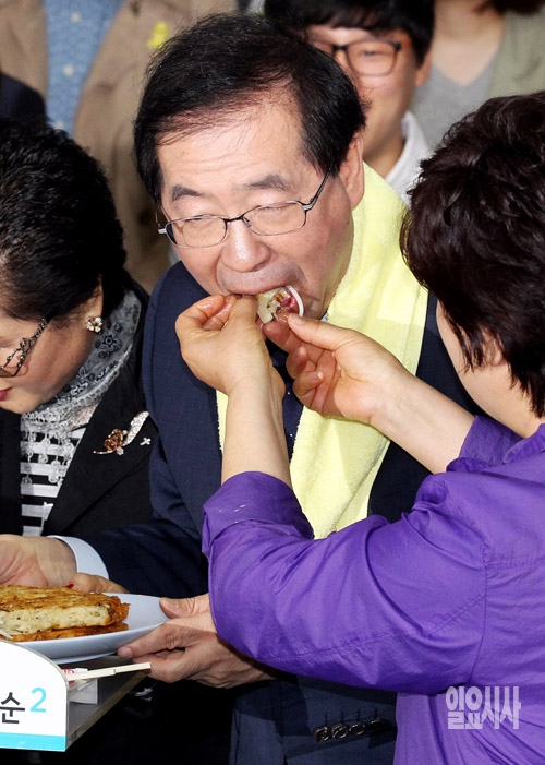 박원순 새정치민주연합 서울시장 후보가 20일 서울 종로구 원순씨 캠프희망에서 열린 오픈하우스 캠프 출범식에서 광장시장 상인들에게 받은 빈대떡을 먹고 있다.