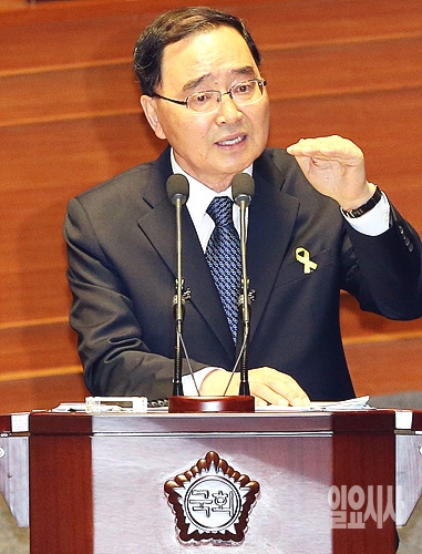 정홍원 국무총리가 20일, 국회 본회의에서 열린 세월호 침몰사고 긴급현안질문에서 의원들의 질의에 답변하고 있다.