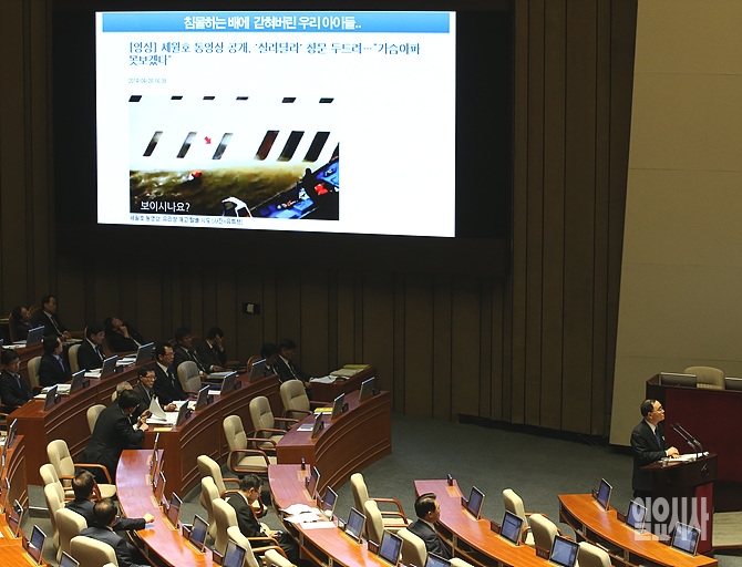 정홍원 국무총리가 20일, 국회 본회의에서 열린 세월호 침몰사고 긴급현안질문에서 새정치민주연합 우원식 의원의 동영상 자료에 대한 질의에 답변하고 있다.