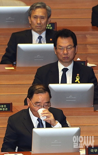 20일, 서울 여의도 국회 본회의장에서 열린 세월호 관련 긴급현안질문에 정홍원 국무총리, 서남수 교육·김관진 국방부 장관이 대기하고 있다.