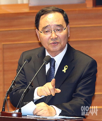 20일, 서울 여의도 국회 본회의장에서 열린 세월호 관련 긴급현안질문에서 정홍원 국무총리가 의원들이 질의에 답변하고 있다.