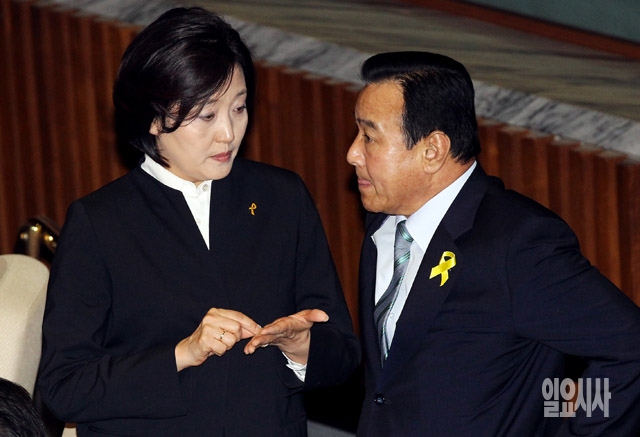 이완구 새누리당 원내대표(오른쪽)와 박영선 새정치민주연합 원내대표가 21일 서울 여의도 국회에서 열린 본회의에서 이야기를 나누고 있다.