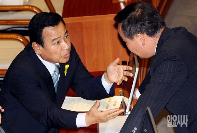 새누리당 이완구 원내대표(왼쪽)와 김재원 원내수석부대표가 21일 서울 여의도 국회에서 열린 본회의에서 이야기를 나누고 있다.