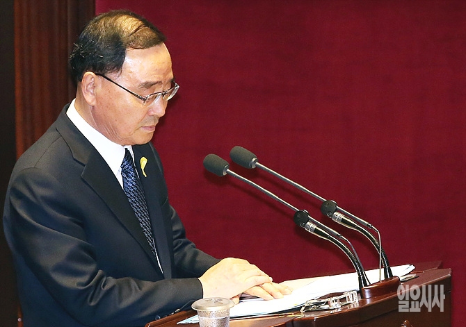 21일, 정홍원 국무총리가 서울 여의도 국회 본회의장에서 열린 세월호 참사 관련 긴급현안질의 직전, 답변서를 바라보고 있다.
