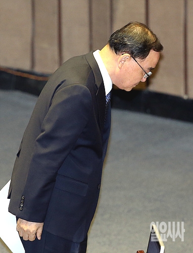 21일, 정홍원 국무총리가 서울 여의도 국회 본회의장에서 열린 세월호 참사 관련 긴급현안질의 직전, 의원들에게 인사하고 있다.