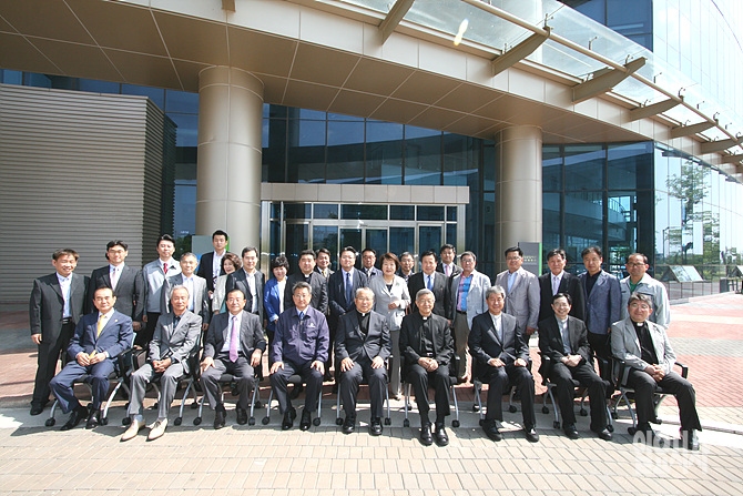 21일 오후, 추기경 사상 최초로 북한을 방문한 염수정 추기경 방북단이 남북출입사무소 앞에서 기념촬영을 하고 있다.
