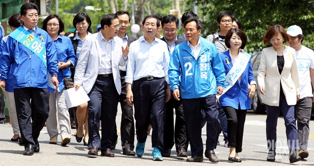 박원순 새정치민주연합 서울시장 후보가 22일 서울 대치동 은마상가 앞에서 강남지역 후보들을 지원하기 위해 걸어가고 있다.