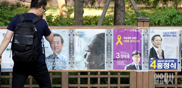 6·4 지방선거 공식 선거운동이 시작된 22일 서울 종로구의 한 거리에 서울시장 후보들의 선거벽보가 부착돼 있다.