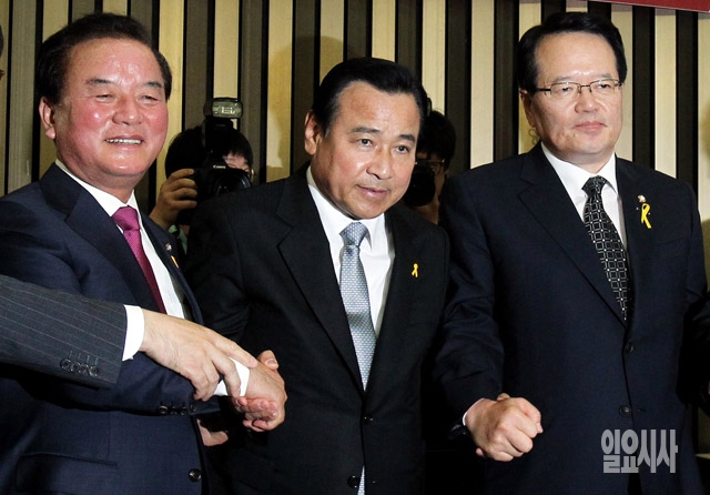 23일 서울 여의도 국회에서 열린 '19대 국회 후반기 당 국회의장·부의장 후보자 선출 선거' 새누리당 의원총회에서 국회부의장 후보자로 선출된 정갑윤 의원(왼쪽부터), 이완구 원내대표, 국회의장 후보자로 선출된 정의화 의원이 손을 잡고 인사하고 있다.