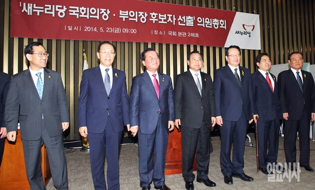 23일 서울 여의도 국회에서 열린 '19대 국회 후반기 당 국회의장·부의장 후보자 선출 선거' 새누리당 의원총회에서 선출된 후보들과 지도부가 포즈를 취하고 있다. 왼쪽부터 주호영 정책위의장, 정갑윤 의원, 이완구 원내대표, 정의화 의원, 이병석 국회부의장, 심재철 의원.