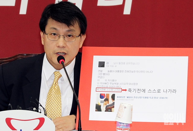 윤상현 새누리당 사무총장이 23일 서울 여의도 국회에서 열린 비상대책위원회의에서 서울시 공무원 김 모씨가 페이스북에 박근혜 대통령을 비방한 것에 대해 설명을 하고 있다.