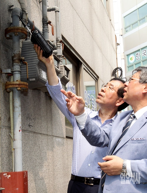 박원순 새정치민주연합 서울시장 후보가 23일 서울 제기동 한방약령시를 찾아 화재 안전 점검을 하고 있다.
