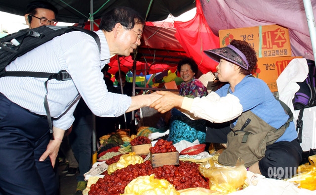박원순 새정치민주연합 서울시장 후보가 23일 서울 제기동 경동시장을 찾아 상인들과 인사하고 있다.