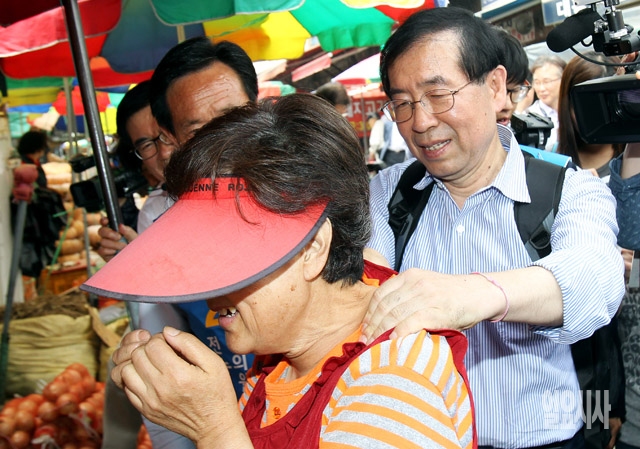 박원순 새정치민주연합 서울시장 후보가 23일 서울 제기동 경동시장을 찾아 한 상인들에게 안마를 해주고 있다.