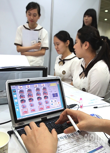 서울 강남구 삼성동 코엑스에서 26일, 열린 '2014 청년일자리 박람회'에서 학생들이 전문적성검사신청서를 작성하고 있다.