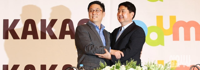 26일 서울 소공로 더 플라자 호텔에서 최세훈 다음커뮤니케이션 대표(왼쪽)와 이석우 카카오 대표가 통합법인 '다음 카카오' 출범 관련 기자회견을 갖고 있다.