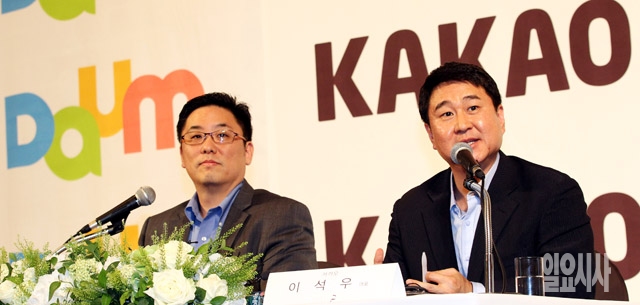26일 서울 소공로 더 플라자 호텔에서 최세훈 다음커뮤니케이션 대표(왼쪽)와 이석우 카카오 대표가 통합법인 '다음 카카오' 출범 관련 기자회견을 갖고 있다.