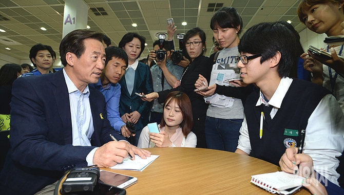 26일, 새누리당 정몽준 서울후보가 서울 코엑스 취업박람회장을 찾은 한 학생의 이야기를 듣고 있다.