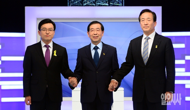 26일 서울 여의도 MBC 스튜디오에서 열린 TV토론회에서 새누리당 정몽준(오른쪽부터), 새정치민주연합 박원순, 통합진보당 정태흥 서울시장 후보가 포즈를 취하고 있다. (사진공동취재단)