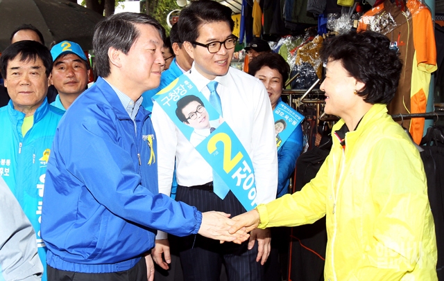안철수 새정치민주연합 공동대표가 27일 서울 성동구 성수동 뚝도시장을 찾아 정원오 성동구청장 후보와 함께 상인들을 만나 인사를 나누고 있다.