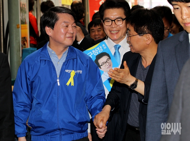 안철수 새정치민주연합 공동대표가 27일 서울 성동구 성수동 뚝도시장을 방문, 정원오 성동구청장 후보와 함께 시장을 둘러보고 있다.