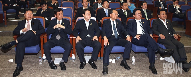 27일, 서울 여의도 국회 의원회관서 열린 '19대 국회 하반기 상임위원장단 선출 의원총회'에 홍문종, 진영, 정우택, 이완구 등 후보자들이 앞자리에 앉아 있다.