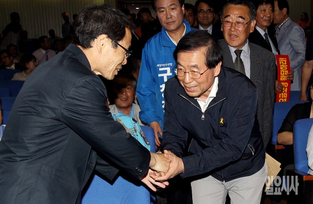박원순 새정치민주연합 서울시장 후보가 27일 서울 송파구 신천동 교통회관에서 열린 서울 개인택시운송사업조합 창립기념식에서 참석자들과 인사를 나누고 있다.