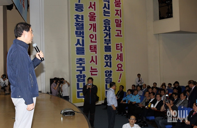 박원순 새정치민주연합 서울시장 후보가 27일 서울 송파구 신천동 교통회관에서 열린 서울 개인택시운송사업조합 창립기념식에서 인사말을 하고 있다.
