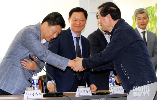 박원순 새정치민주연합 서울시장 후보가 27일 서울 송파구 신천동 교통회관에서 열린 서울택시운송사업조합 이사회를 방문, 관계자들과 인사하고 있다.