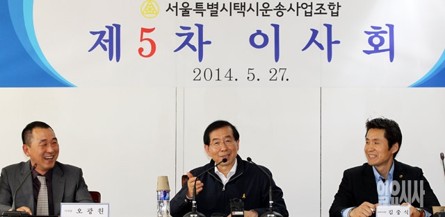 박원순 새정치민주연합 서울시장 후보가 27일 서울 송파구 신천동 교통회관에서 열린 서울택시운송사업조합 이사회를 방문, 인사말을 하고 있다.