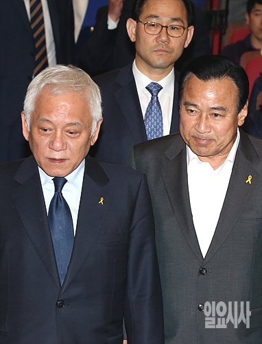 27일 오후, 서울 여의도 국회 의원회관에서 열린 여야 지도부와 세월호 참사 유가족 및 실종자 가족들과의 간담회 참석을 위해 새정치민주연합 김한길 공동대표와 새누리당 이완구 원내대표가 간담회장 안으로 입장하고 있다.